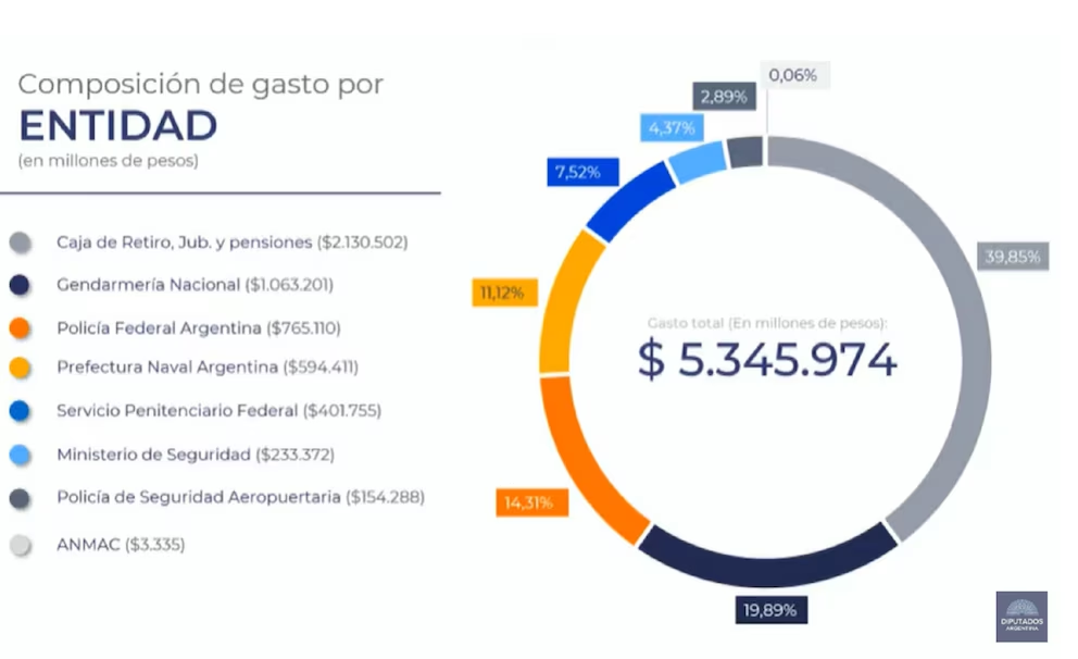 Bullrich explicó que el aumento del 19% en Seguridad no es todo lo que se necesita, pero “es lo que el país puede dar”. En concreto detalló que serán $594 mil millones para la Prefectura Naval, lo que representa una actualización del 24,9%; $154 mil millones para la PSA, una actualización del 20,5%; $1.063.000 millones para la Gendarmería, un aumento del 19,5%; $401 mil millones para el Servicio Penitenciario (18,1%); $765 mil millones para Policía Federal Argentina, una actualización del 15,2%.