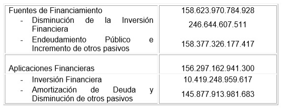 Se indican a continuación las Fuentes de Financiamiento y las Aplicaciones Financieras que se detallan en las Planillas 11, 12, 13, 14 y 15 Anexas al presente artículo:
