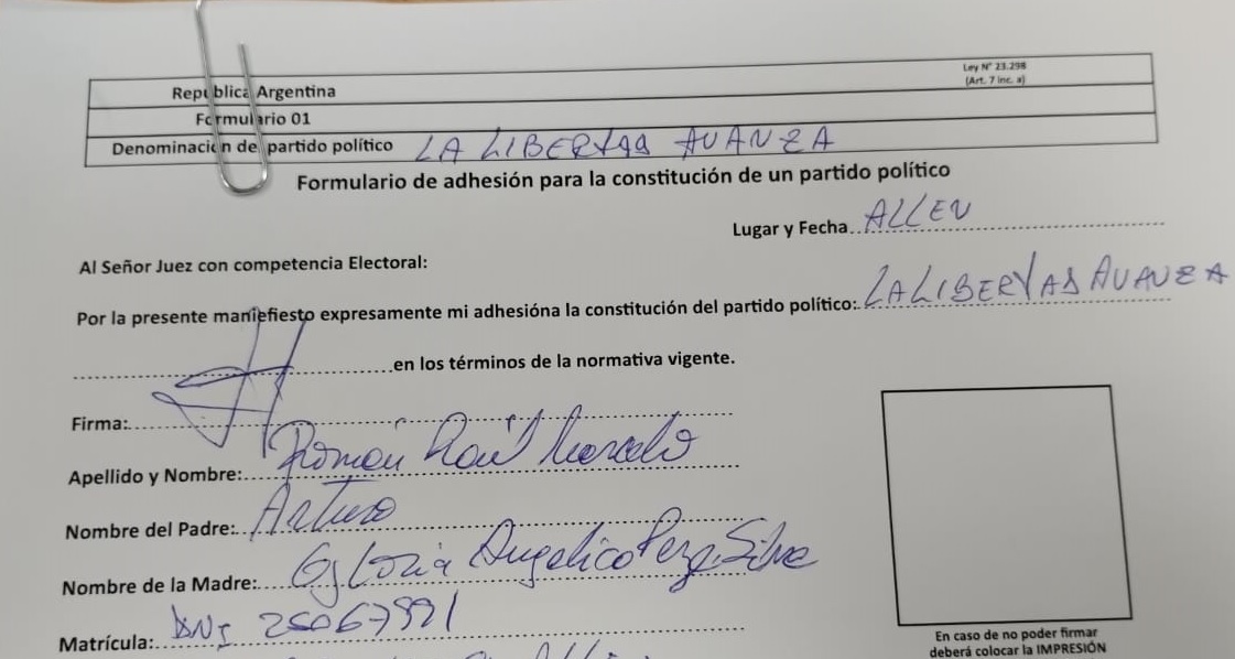 La Libertad Avanza viene trabajando en ese proceso desde principios de este año y esta semana presentó ante el Juzgado Federal de Viedma, donde funciona la Secretaría Electoral, un total de 2.565 fichas de adhesión.