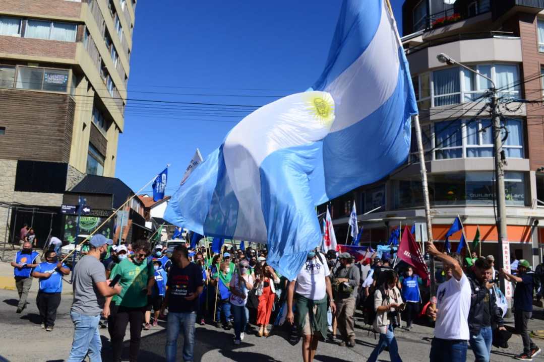 Los líderes de la CTA Autónoma de Río Negro, Rodolfo Aguiar, y la CTA de los Trabajadores, Jorge Molina, encabezaron la protesta en la calle Juramento donde se exhibieron banderas con pedidos por la “soberanía” del lago Escondido.