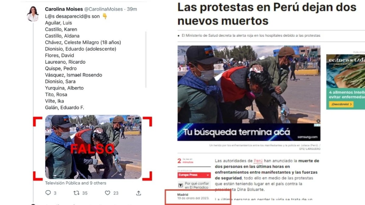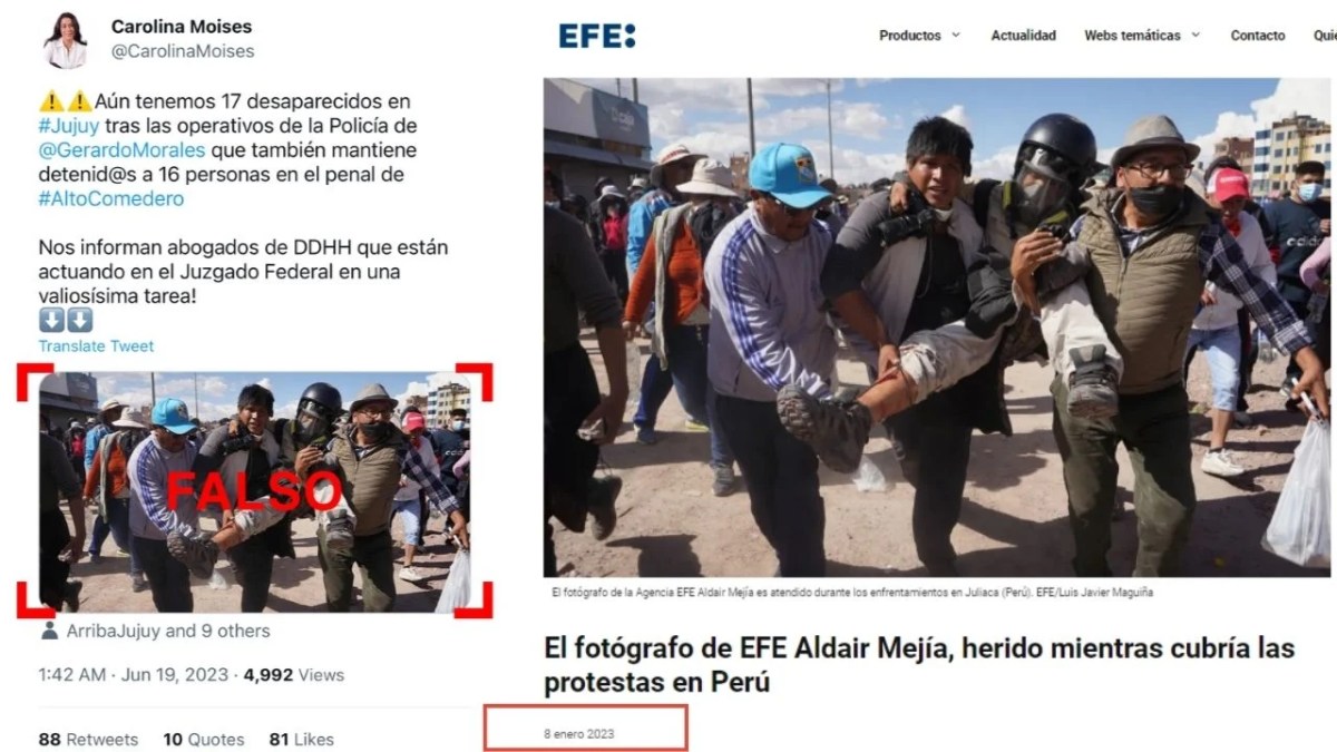 Varios usuarios de redes sociales (1, 2 y 3), entre ellos el conductor Horacio Cabak, señalaron que la diputada nacional por Jujuy, Carolina Moisés (Frente de Todos), tuiteó supuestas fotos del conflicto en esa provincia que, en realidad, corresponden a una manifestación en Perú. Esto es cierto: la diputada utilizó imágenes de otro suceso para hablar de Jujuy.