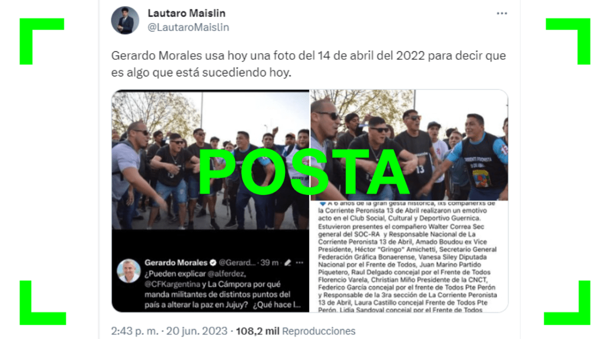 “Gerardo Morales usa hoy una foto del 14 de abril del 2022 para decir que es algo que está sucediendo hoy”, tuiteó el periodista de C5N Lautaro Maislin, afirmación que fue replicada por varias cuentas en Twitter. Esto es verdadero. El gobernador Gerardo Morales (Unión Cívica Radical) tuiteó una foto de militantes para ilustrar el conflicto de Jujuy, aunque no es actual, sino de 2022, y tampoco fue tomada en esa provincia, sino en la Provincia de Buenos Aires.
