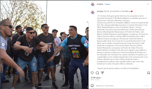 Publicación de @la13pba, cuenta de Instagram de la Agrupación Peronista 13 de Abril, de Guernica.