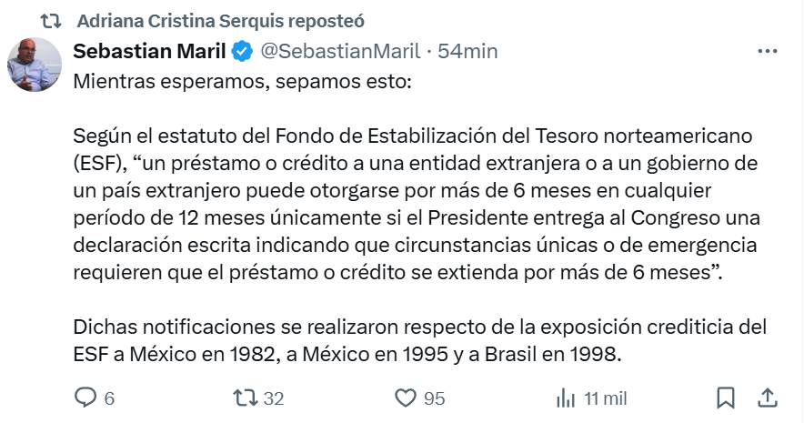 Sostuvo que, según el estatuto del Fondo de Estabilización del Tesoro norteamericano (ESF), “un préstamo o crédito a una entidad extranjera o a un gobierno de un país extranjero puede otorgarse por más de 6 meses en cualquier período de 12 meses únicamente si el presidente entrega al Congreso una declaración escrita indicando que circunstancias únicas o de emergencia requieren que el préstamo o crédito se extienda por más de 6 meses”.