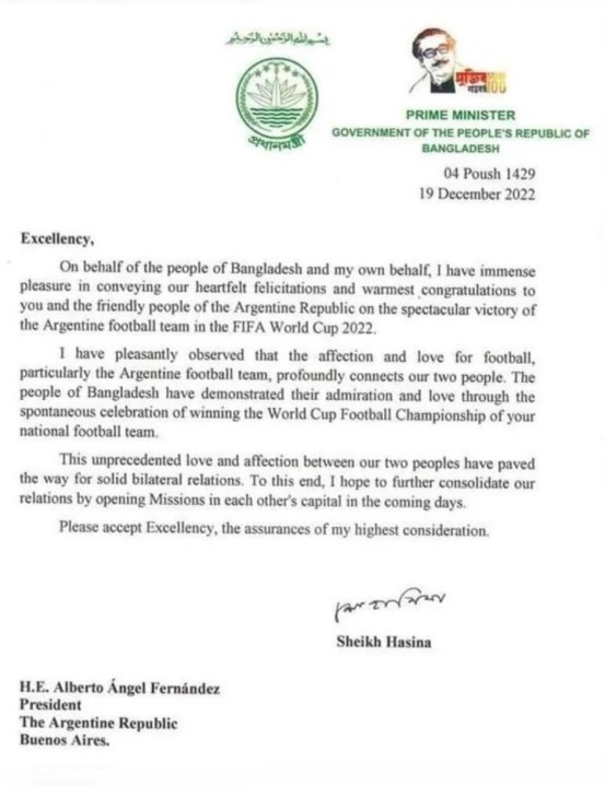 En el inicio de la carta, Hasina había transmitido sus “más sinceras felicitaciones” al Presidente y “al pueblo amigo de la República Argentina por la espectacular victoria de la selección argentina de fútbol en la Copa Mundial”.