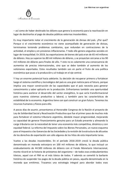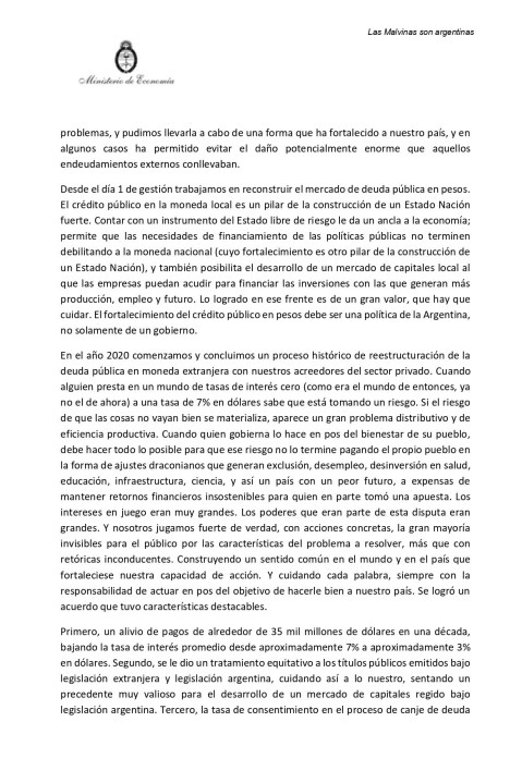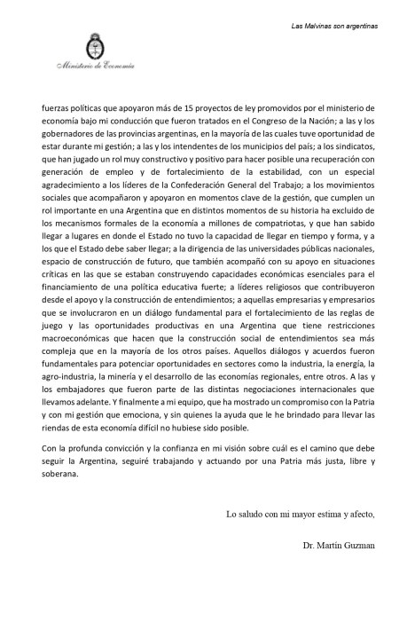 “Quiero agradecerle profundamente por confiar en mí y en el equipo que hemos conformado en el Ministerio por estos más de 30 meses de trabajo, los cuales estuvieron marcados por un escenario absolutamente singular. Al asumir nuestro gobierno, Argentina se encontraba sumida en una profunda crisis económica, social y de deuda, y a ello se le agregó primero una pandemia global y luego la actual guerra en Ucrania, que han sido profundamente disruptivas del funcionamiento del sistema económico internacional”, escribió Guzmán en su carta de renuncia.