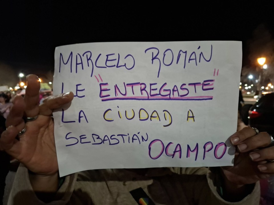 En algunos carteles se apuntó contra Sebastián Ocampo, empresario de medios, denunciado por su participación y usurpación de autoridad, y contra el intendente, Marcelo Román, principal apuntado por delito de peculado.