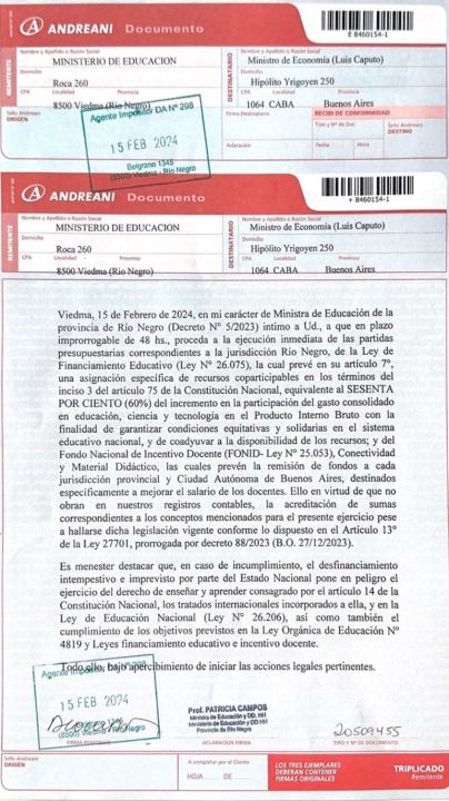 La carta documento del gobierno está dirigida al ministro de Economía, Luis Caputo, y al secretario de Educación, Carlos Torrendell, solicitando que en un plazo de 48 horas se realice la ejecución de la Ley de Financiamiento Educativo (Ley N° 26.075), la cual prevé una asignación específica de recursos coparticipables equivalente al 60% del incremento en la participación del gasto consolidado en educación, ciencia y tecnología en el Producto Interno Bruto.