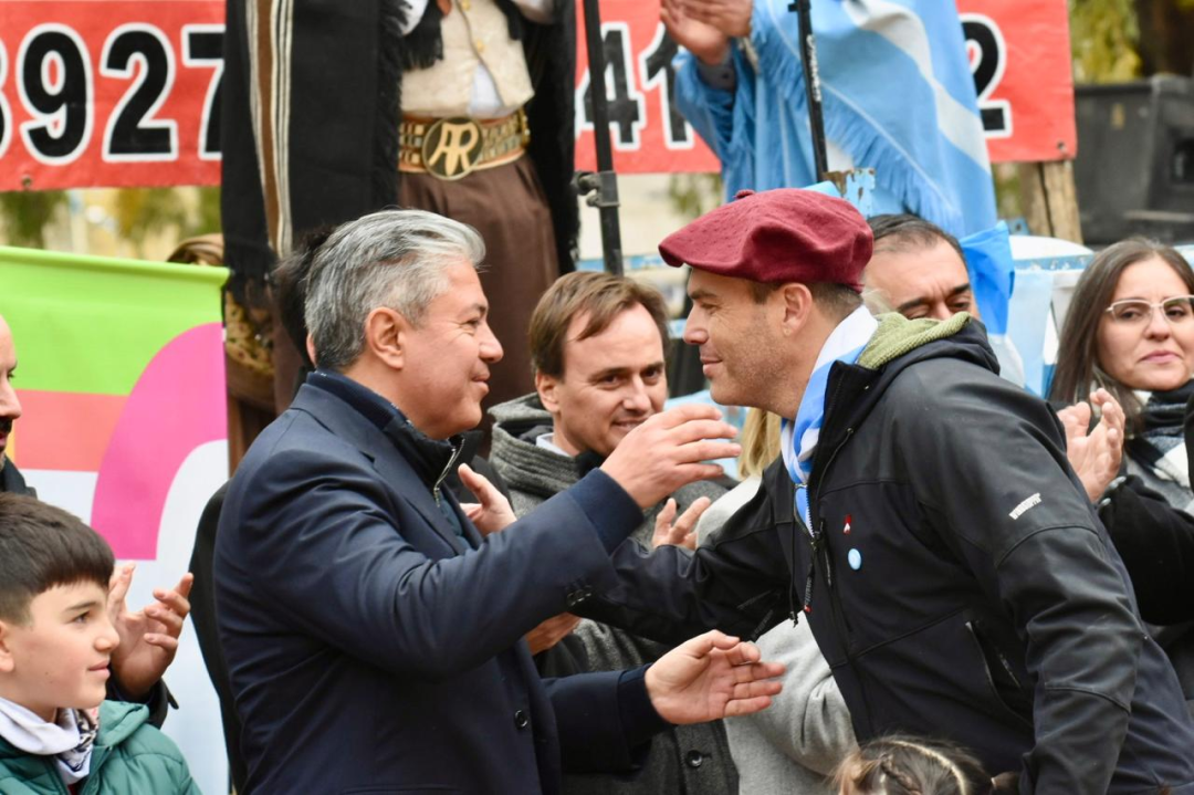 La foto protocolar del Gobernador fue este año junto al jefe comunal de Centenario, Esteban Cimolai. Ambos entraron a caballo y encabezaron el acto en el predio "El Estribo".