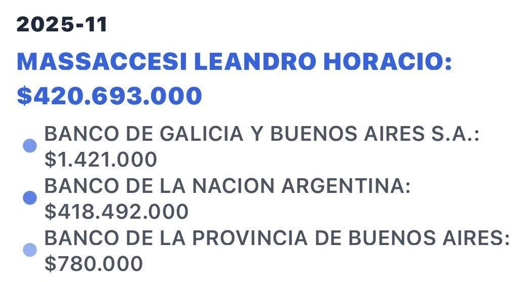 Leandro Massaccesi —hijo de Horacio, exgobernador de Río Negro— había tomado un préstamo cercano a los 420 millones de pesos, de acuerdo a la información difundida por el periodista Manu Jove, quien detalló que el ahora exfuncionario figuraba en una lista de dirigentes que accedieron a líneas crediticias de la entidad estatal.