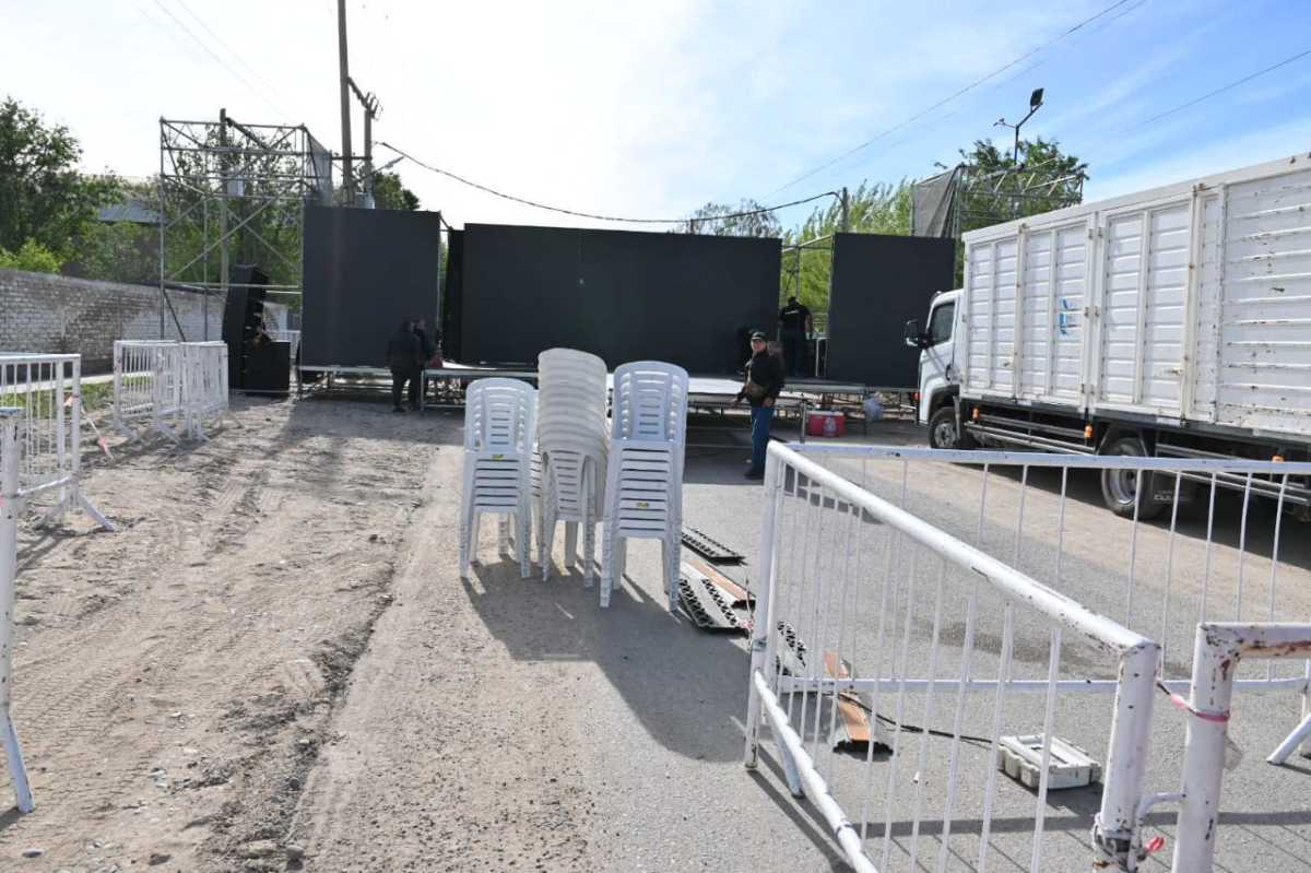 Trabajadores municipales ultimaban los detalles para el armado del escenario y las ubicaciones donde en la Primera Cooperativa Frutícola, donde se espera que esta tarde cientos de personas lleguen para brindar el respaldo al candidato a presidente de Unión por la Patria y actual ministro de Economía, Sergio Massa.