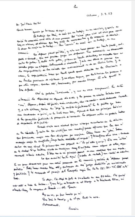 «Hace unos días atrás, le envié una carta a él para contarle acerca de la tarea que me toca como defensor penal y de la situación del hacinamiento actual en las comisarías de Neuquén, de la que poco se habla y mucho molesta. Fue una especie de catarsis que realicé para/con él, pero no esperaba tener una respuesta del papa, sinceramente» señala el defensor. Para su sorpresa, al día siguiente, el 3 de febrero pasado, recibió una misiva de puño y letra del propio Francisco. «Una nota muy extensa, de mucha reflexión acerca de la superpoblación carcelaria, de lo que siente él con las personas vulnerables, de la prisión preventiva y de -como dice él- la lucha dialéctica entre misericordia y justicia» comentó el defensor neuquino. Y aunque aclaró que «la carta está dirigida a mí, pero es claro que trasciende lo personal. La considero una honda reflexión sobre la situación de las personas encerradas en comisarías» señaló el letrado.