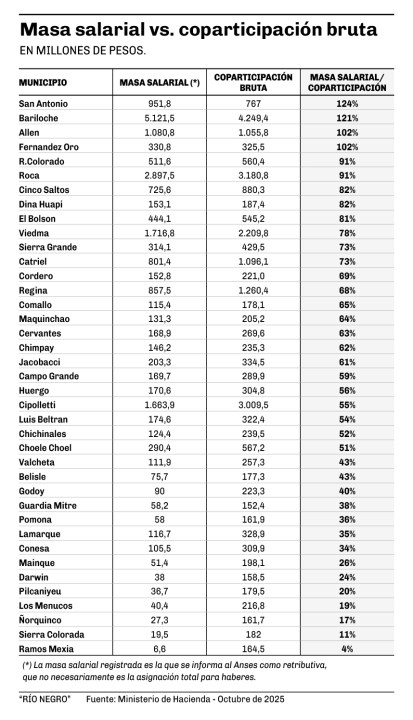 Al profundizar en ese informe de Hacienda, hay cuatro municipios rionegrinos que no logran cubrir sus obligaciones salariales con la coparticipación bruta. Lidera San Antonio, con el 124%, seguido por Bariloche (121%), Allen (102%) y Fernández Oro (102%).