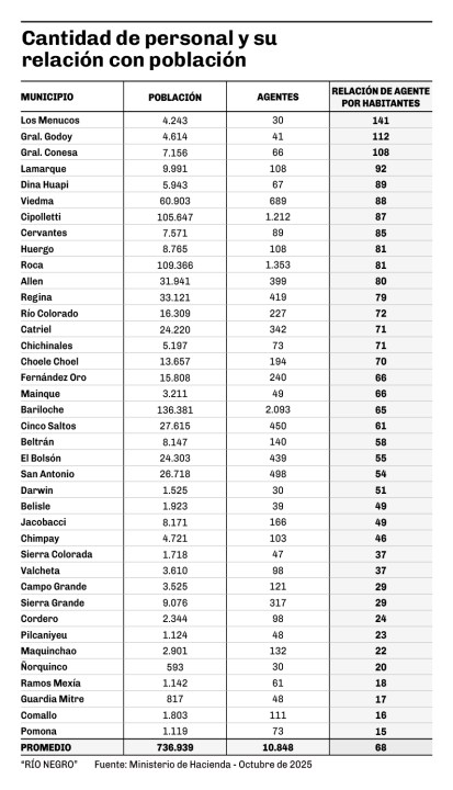 Hay municipios que cumplen con sus servicios con menos agentes y costos. Así, Los Menucos presenta una relación de un empleado por cada 141 residentes, pero otros tienen más personal y desembolsos, llegando a un estatal por cada 15 vecinos, como en Pomona (ver infografía).