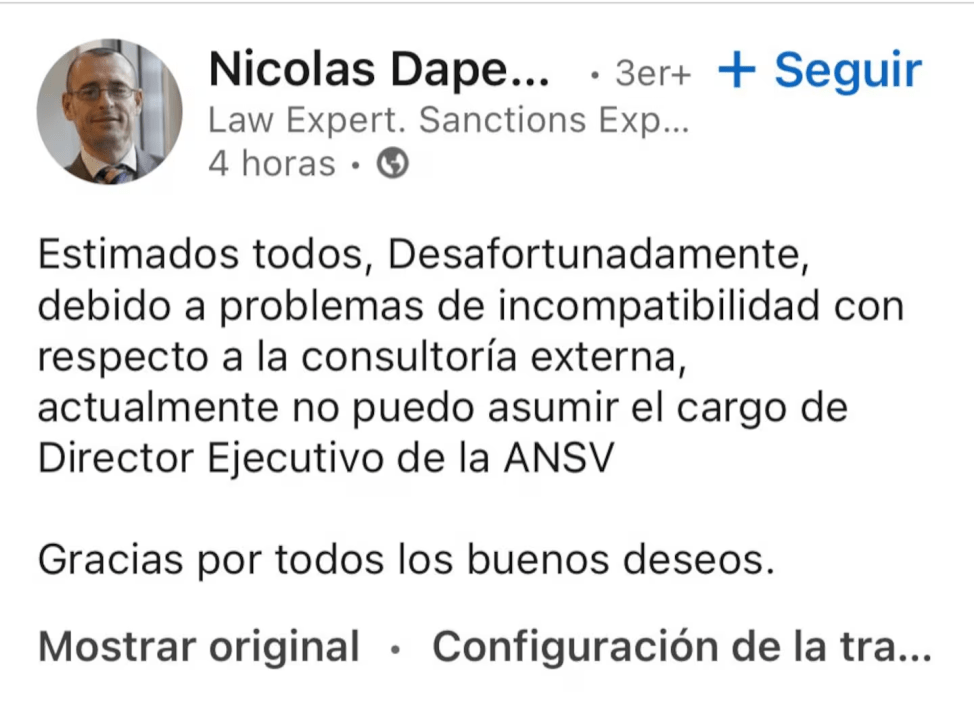 “Desafortunadamente, debido a problemas de incompatibilidad con respecto a la consultoría externa, actualmente no puedo asumir el cargo de director ejecutivo de la ANSV. Gracias por todos los buenos deseos”, publicó Fernández 15 horas después de que salió el decreto.