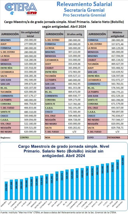 El relevamiento ubica a los docentes rionegrinos que recién se inician en la profesión con el salario de bolsillo más alto del país en abril, con 620.000 pesos, seguido por Neuquén con 559.521 pesos y Santa Cruz en tercer orden con 522.160 pesos. La provincia con salarios más bajos es Misiones donde un docente que recién se inicia tiene un sueldo de 250.000 pesos y la patagónica Chubut se ubica entre los seis peores, con 316.280 pesos el haber de bolsillo para un maestro.