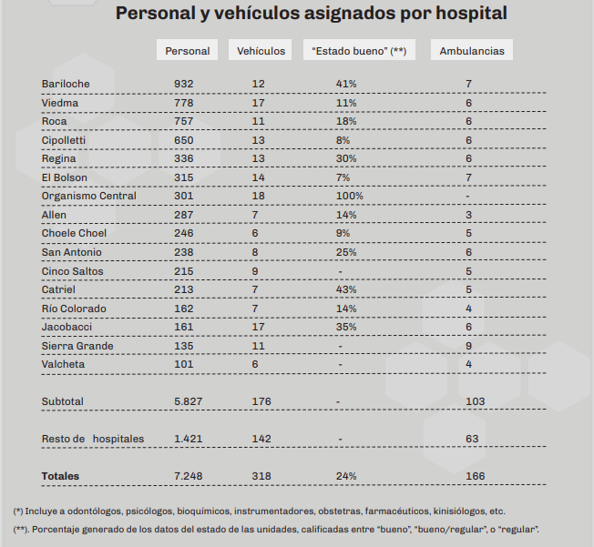 El ministerio de Salud informó el estado del sistema hospitalario, afirmando que existe “respuesta de manera ininterrumpida, continua y permanente” aunque la precariedad se detecta en los datos referidos al estado del parque automotor, y situaciones de problemas de infraestructura o aparatología no resuelta por meses.