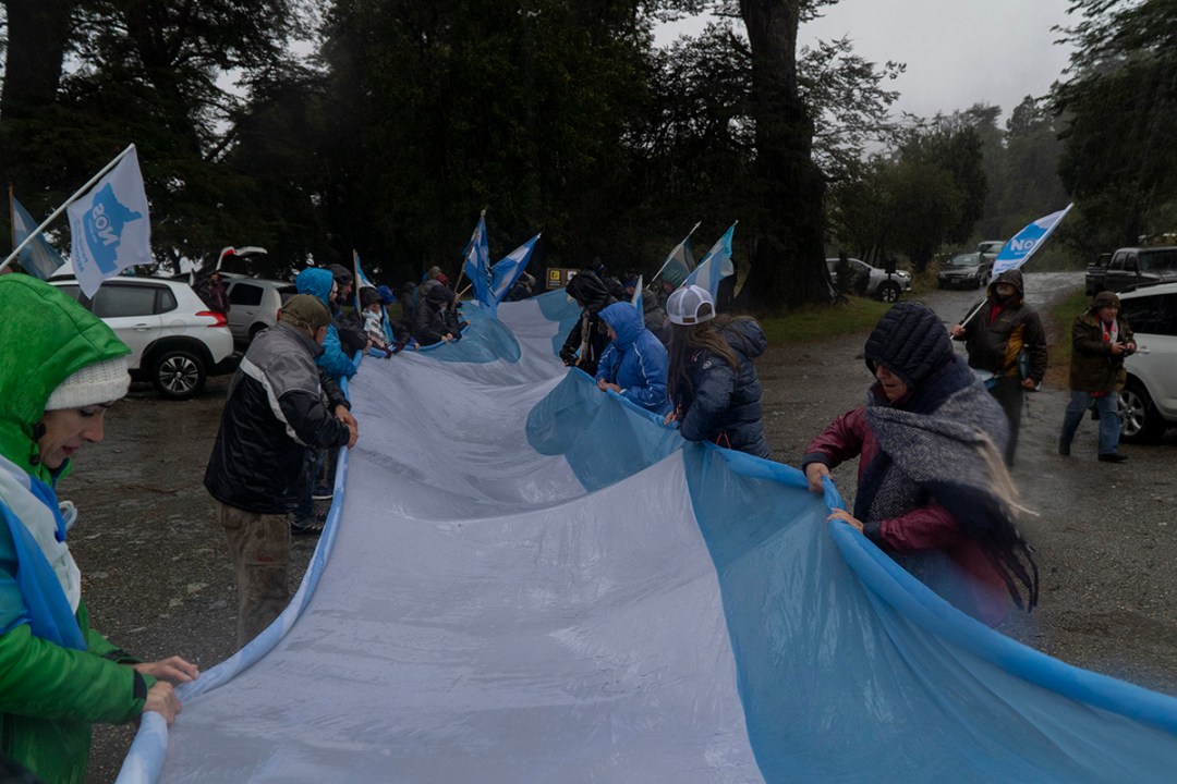 Unos 70 vehículos participaron de la convocatoria, según los organizadores. La lluvia, de intensidad variable, no paró en ningún momento y se convirtió en un diluvio cuando la caravana llegó a Mascardi. Los vehículos bajaron de la ruta y se ubicaron junto a la playa pública ubicada enfrente de las tierras que los integrantes de la comunidad Lafken Winkul Mapu ocuparon desde 2019 hasta octubre pasado, cuando fueron desalojados.