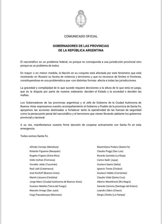 Y añadieron: «Los Gobernadores de las provincias argentinas y el Jefe de Gobierno de la Ciudad Autónoma de Buenos Aires expresamos nuestro acompañamiento al Gobierno y Pueblo de la provincia de Santa Fe, apoyamos las acciones destinadas a fortalecer tanto la operatividad de las fuerzas de seguridad como la persecución penal del narcotráfico y el terrorismo que vienen llevando adelante los gobiernos provincial y nacional».