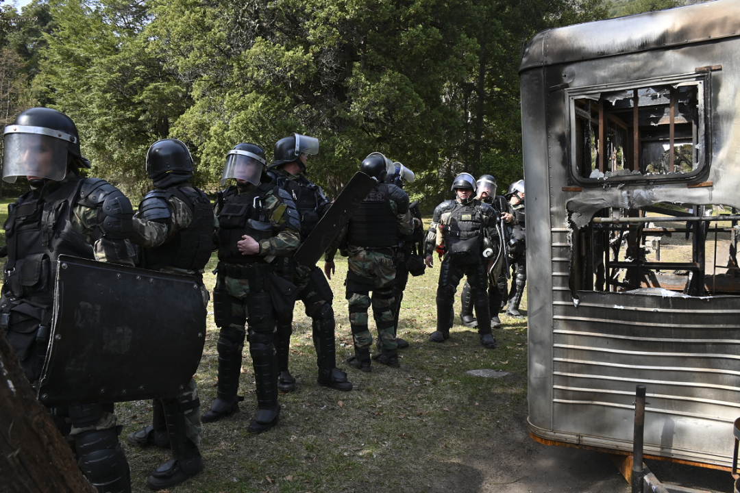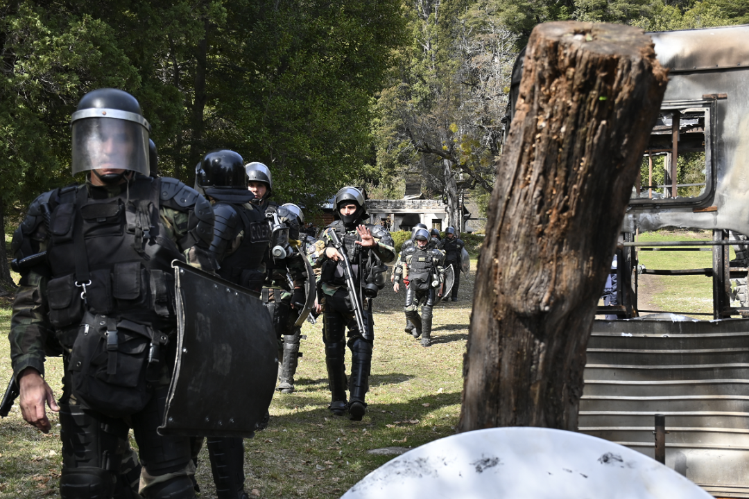 Después de media hora aproximadamente, el grupo COER se retiró en fila por la entrada de Los Radales, que estaba bloqueada parcialmente por los restos de la casilla incendiada tras el ataque perpetrado la noche del domingo contra un grupo de gendarmes que custodiaban esa propiedad. Mientras se hizo la recorrida, un grupo numeroso de policías permaneció en el exterior de Los Radales.
