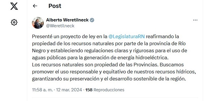 El gobernador Alberto Weretilneck presentó esta mañana un proyecto de ley en la Legislatura para ratificar la propiedad de la provincia de los recursos naturales y, particularmente, su facultad en la concesión del uso del agua pública y su obligada intervención en las concesiones hidroeléctricas, que vencen próximamente.