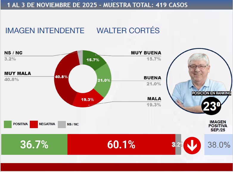 Los intendentes peor calificados del mes de noviembre de 2025 son: en último lugar, Pablo Grasso (Río Gallegos) con un 36,2% de imagen positiva, seguido por Walter Cortés (Bariloche) con un 36,7%, y luego
