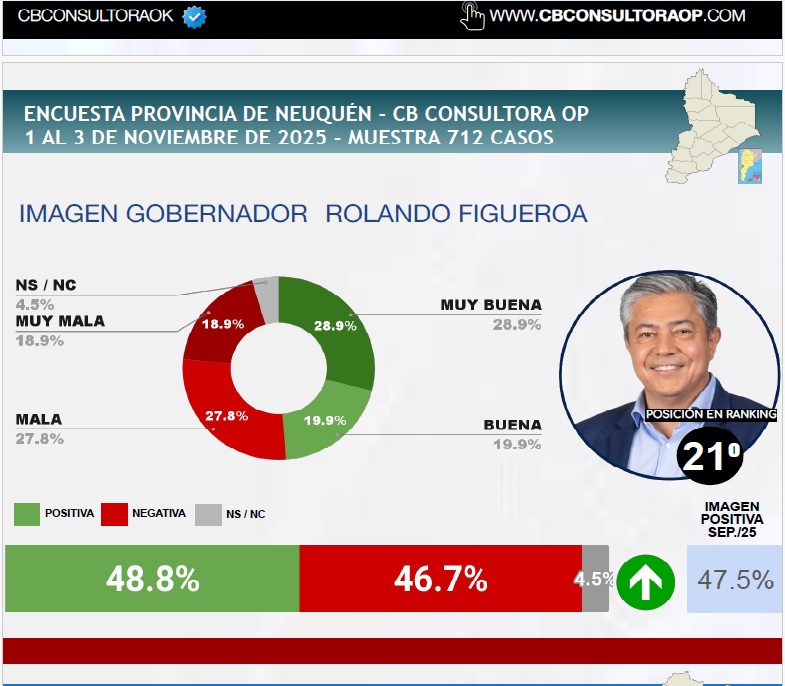 En la provincia de Neuquén, el gobernador neuquino Rolando Figueroa figura en el puesto 21 con un 48.8% de imagen positiva.