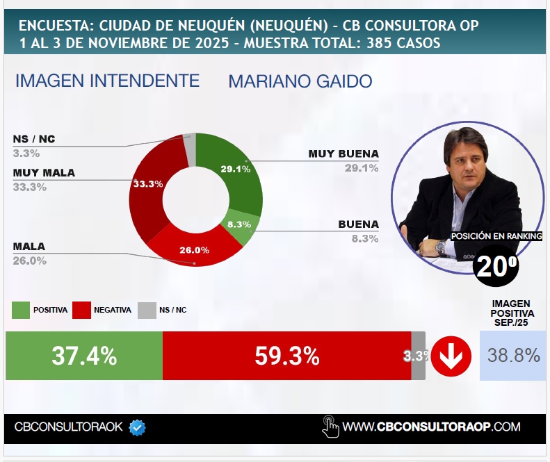 Armando Molina (La Rioja Capital) con un 36,9% de aprobación. El intendente de la capital Neuquina, Mariano Gaido, figura en el puesto 20 entre sus pares, un descenso respecto de mediciones anteriores, con 59,3% de imagen negativa y 37.4% de positiva.