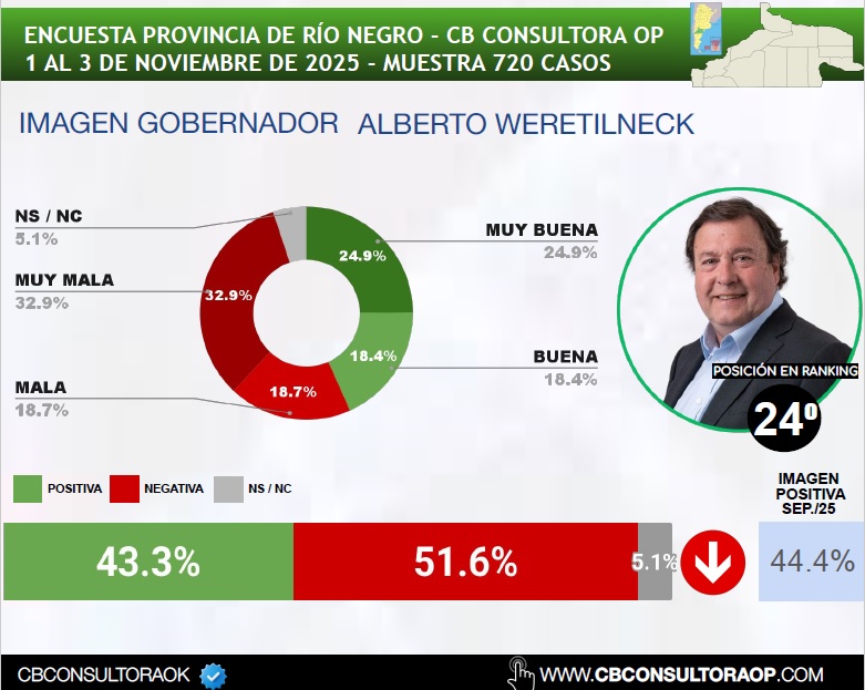 Los gobernadores peor calificados del mes de noviembre de 2025 son: en último lugar, Alberto Weretilneck (Río Negro) con un 43,3% de imagen positiva, seguido por Axel Kicillof (Provincia de Buenos Aires) con un 47,4%, y luego Ricardo Quintela (La Rioja) con un 48,0%.