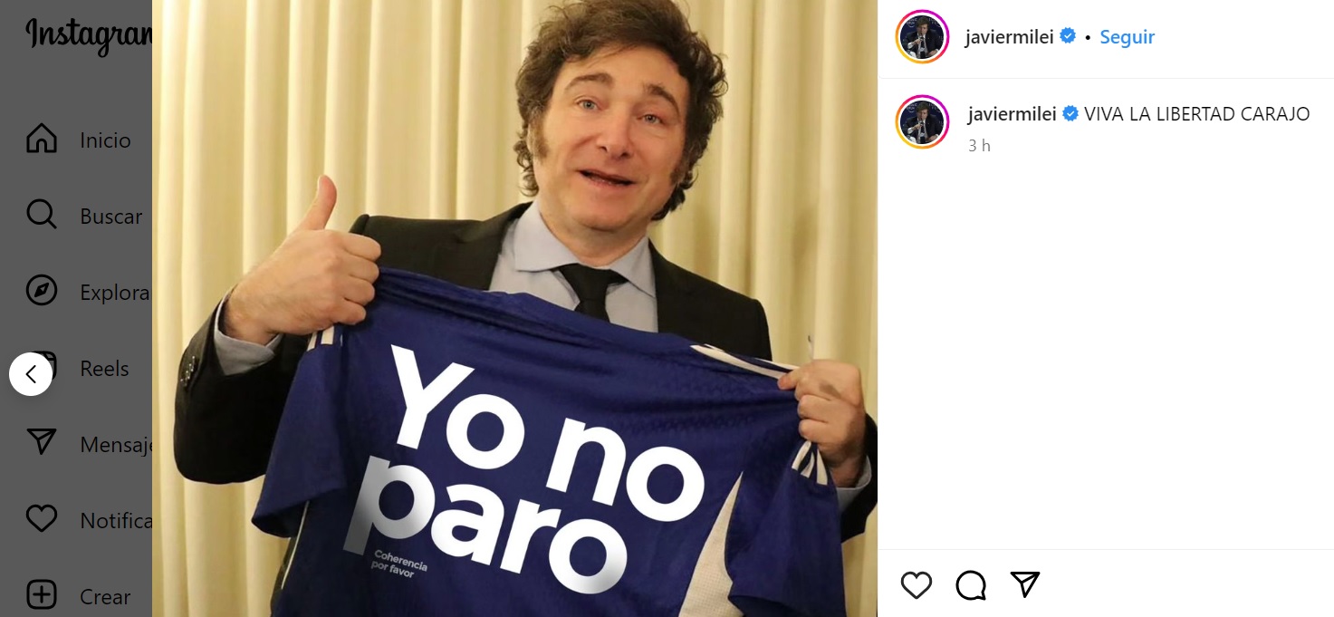 El presidente Javier Milei compartió este miércoles un posteo en Instagram de su imagen (editada) con una camiseta y un mensaje para este jueves, día del paro general de la CGT.