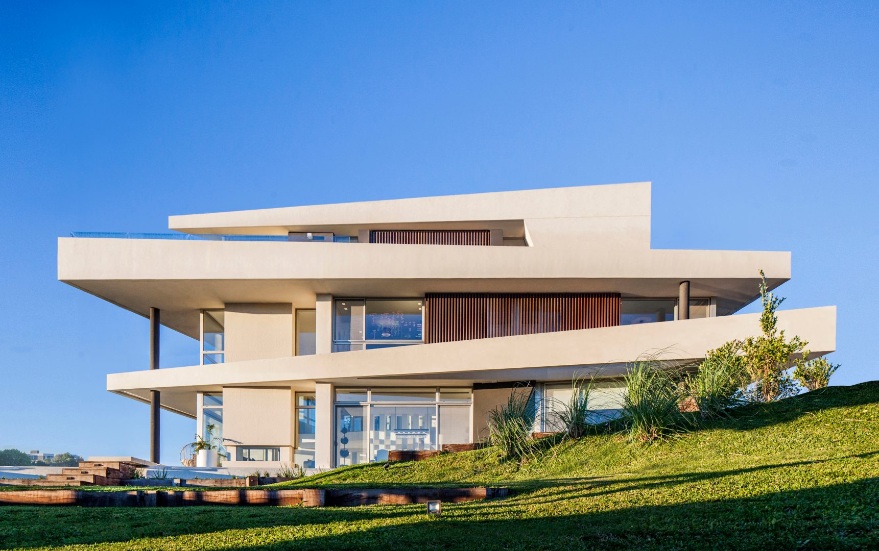 El estudio Apa Arquitectura propuso un proyecto que potencie la observación del paisaje como principal experiencia de hábitat. Para ello, organizó tres niveles o bandejas horizontales que giradas angularmente entre sí, logran una riqueza geométrica a partir de innumerable cantidad de ángulos que juegan a favor de la diversidad de escenas.