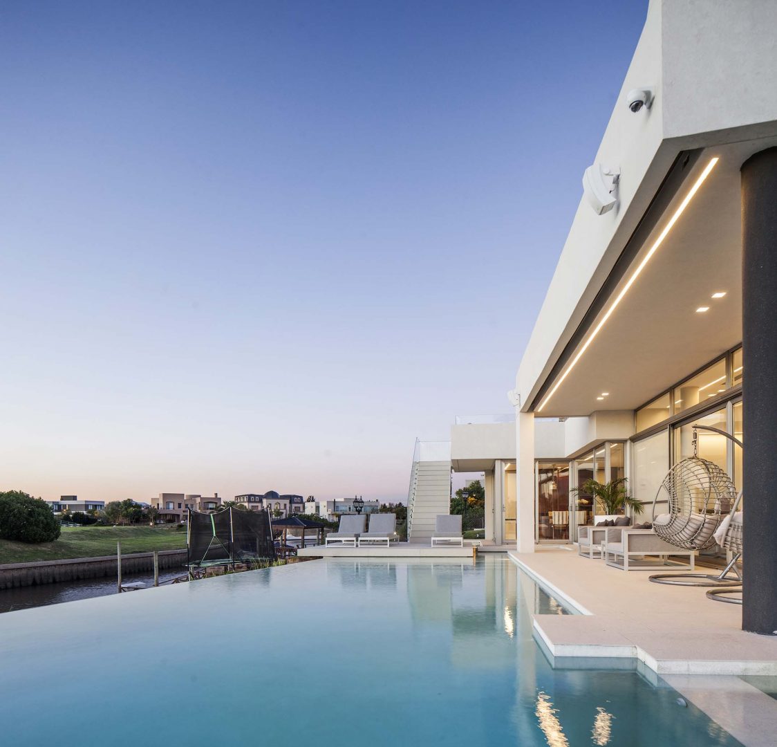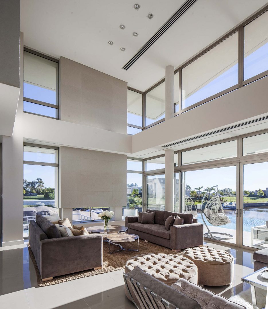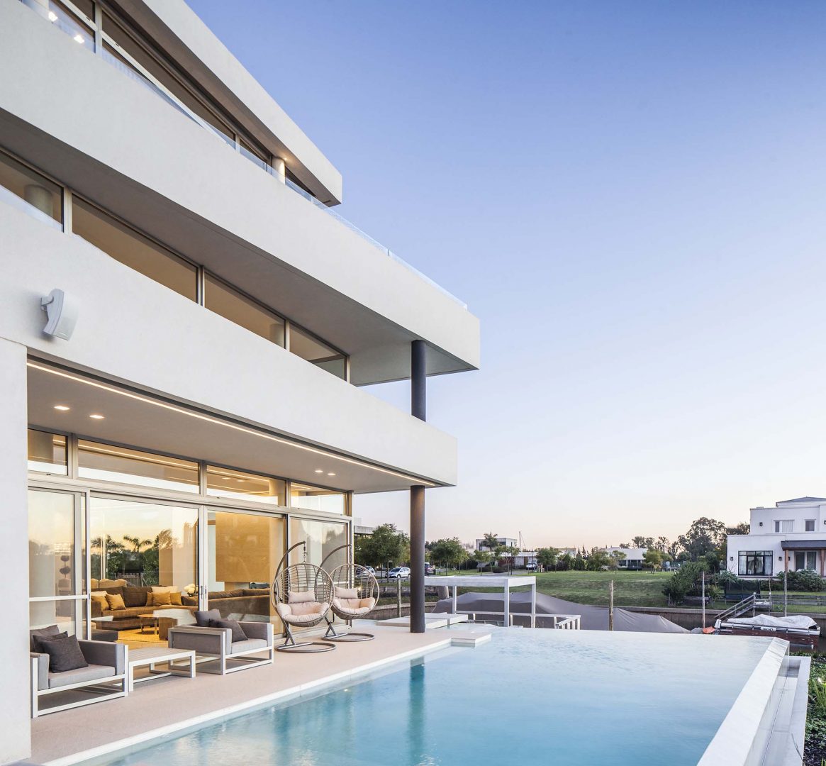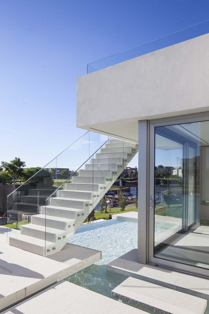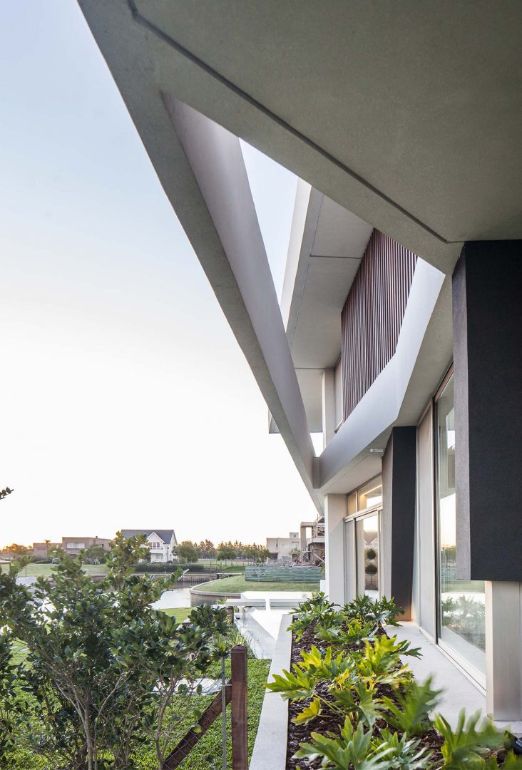 Las fachadas, con importantes superficies vidriadas de piso a techo, logran vistas profundas y ángulos con una visión de 180º, lo que permite un efecto de inmensidad territorial circundante. Así los interiores dialogan con la esquina del canal navegable, logrando múltiples escenas según las horas del día. De esta forma, como consecuencia de la rotación de elementos y ejes compositivos, la casa se convierte en un caleidoscopio para la contemplación de estos privilegiados y cambiantes paisajes.