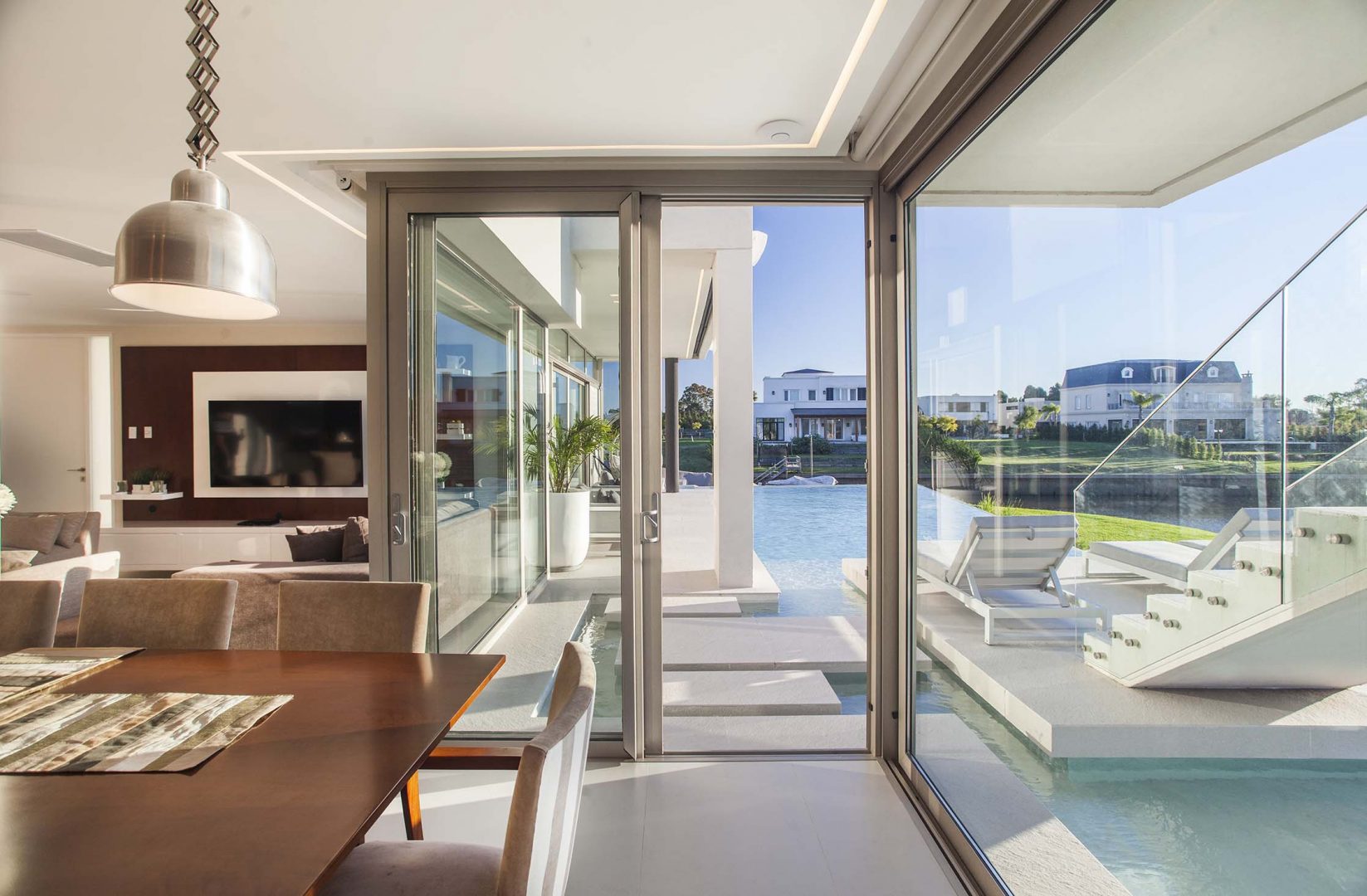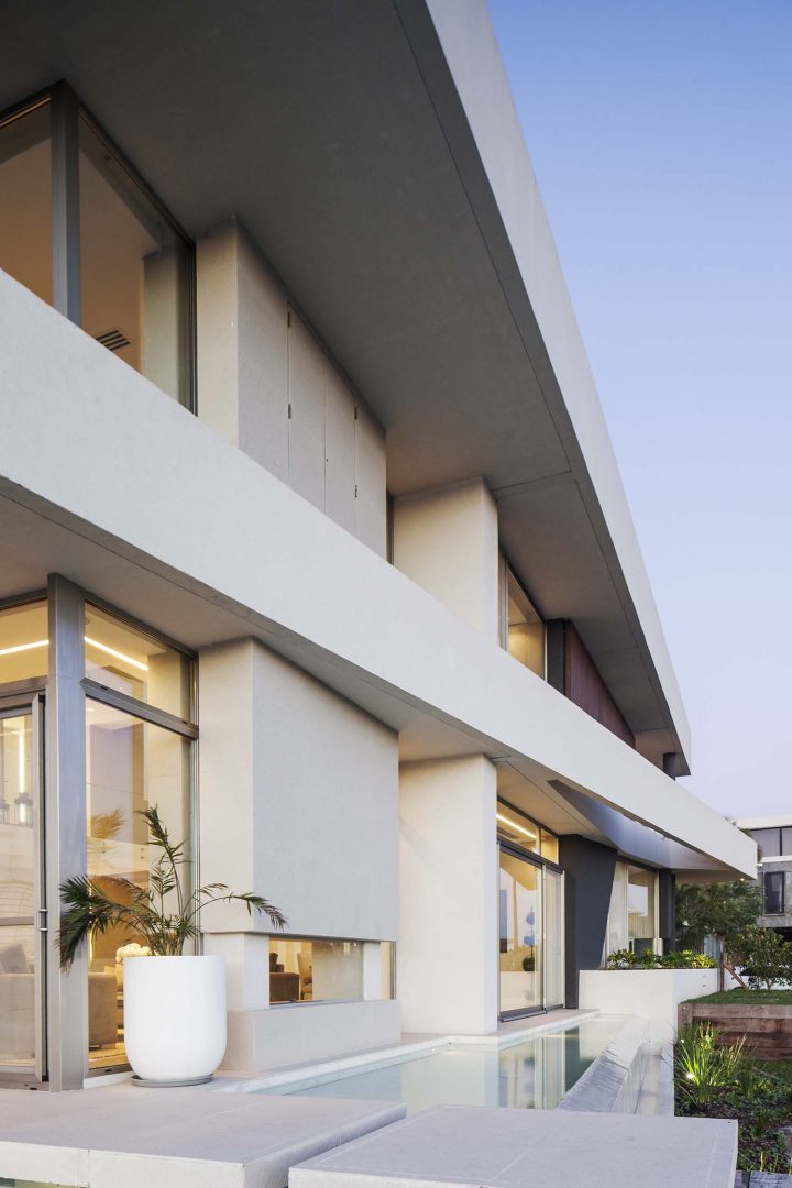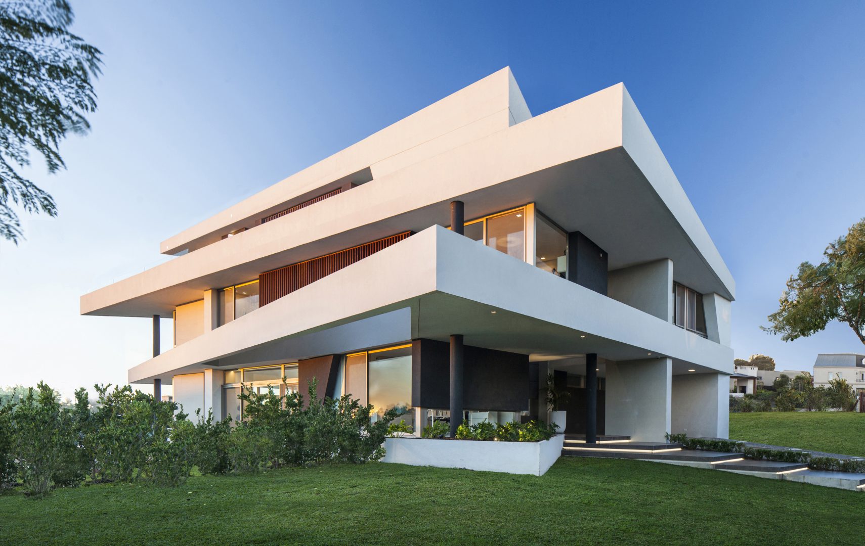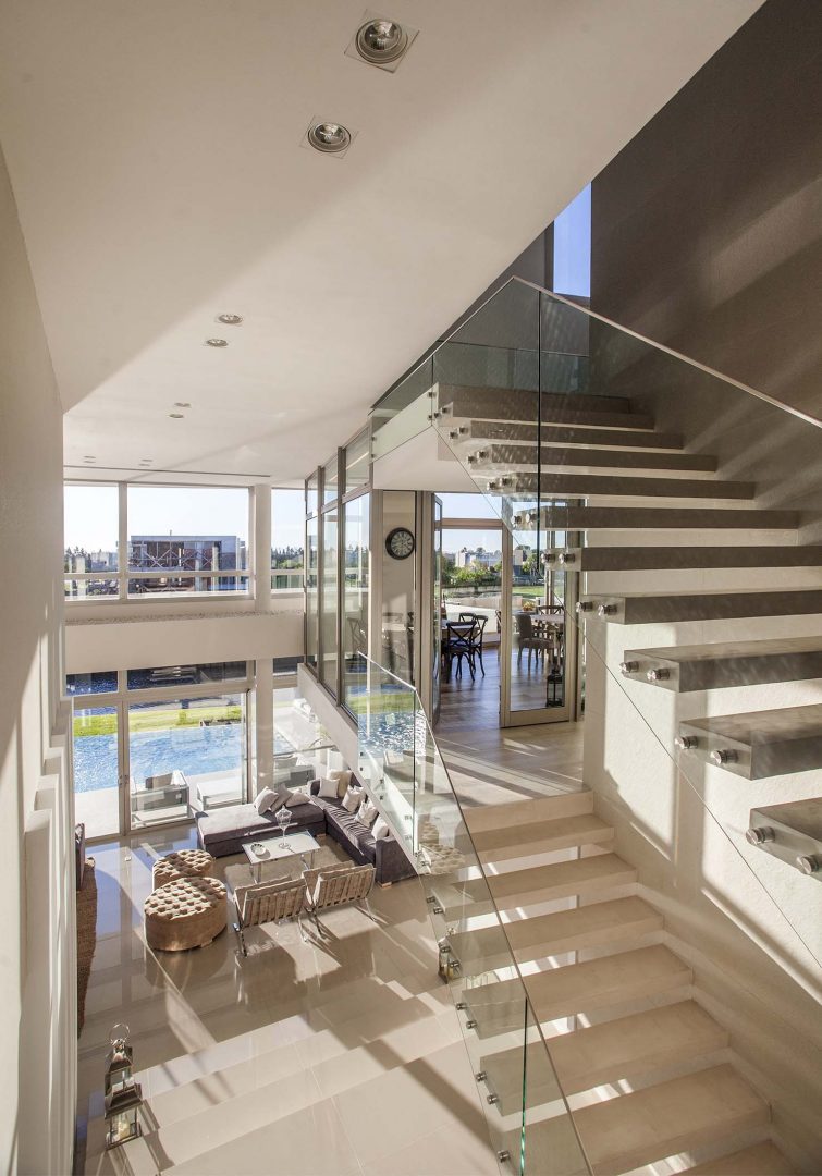 Las fachadas, con importantes superficies vidriadas de piso a techo, logran vistas profundas y ángulos con una visión de 180º, lo que permite un efecto de inmensidad territorial circundante. Así los interiores dialogan con la esquina del canal navegable, logrando múltiples escenas según las horas del día. De esta forma, como consecuencia de la rotación de elementos y ejes compositivos, la casa se convierte en un caleidoscopio para la contemplación de estos privilegiados y cambiantes paisajes.