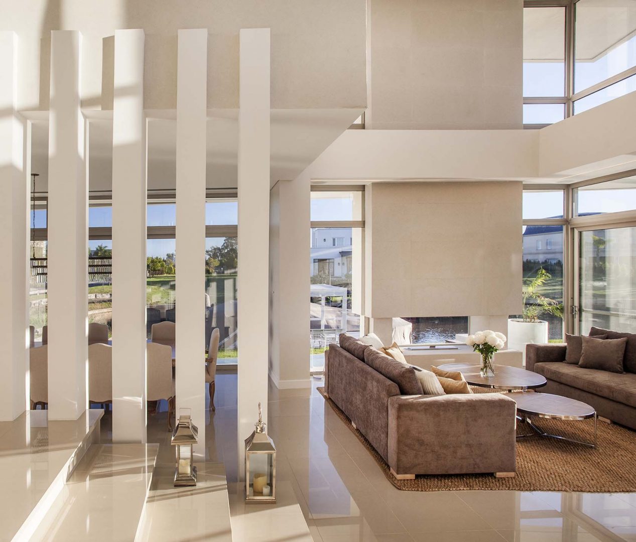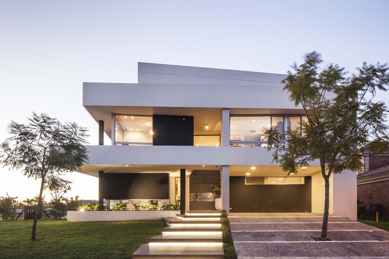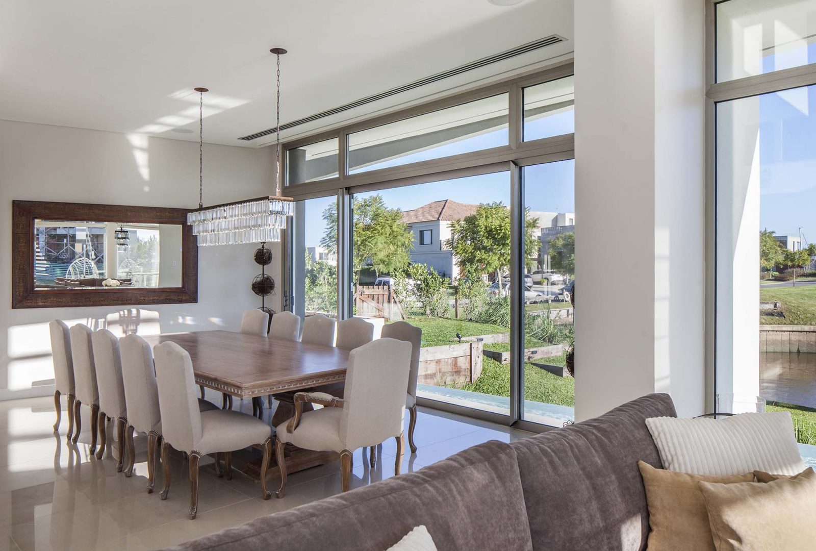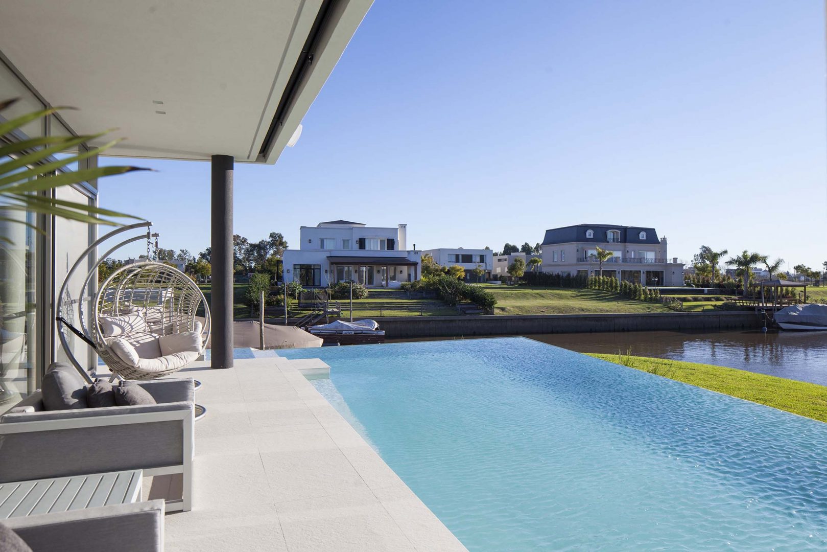 Las fachadas, con importantes superficies vidriadas de piso a techo, logran vistas profundas y ángulos con una visión de 180º, lo que permite un efecto de inmensidad territorial circundante. Así los interiores dialogan con la esquina del canal navegable, logrando múltiples escenas según las horas del día. De esta forma, como consecuencia de la rotación de elementos y ejes compositivos, la casa se convierte en un caleidoscopio para la contemplación de estos privilegiados y cambiantes paisajes.