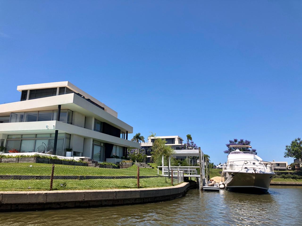 En la planta baja se ubican la zona de recepción, un escritorio, el family, la cocina, el área de servicios y en los exteriores, una piscina envolvente con solarium al cual se puede acceder directo desde la escalera de la casa. También dos muelles para embarcaciones y otro con deck para deportes acuáticos, así como un rincón de fuego para reuniones sociales al aire libre.