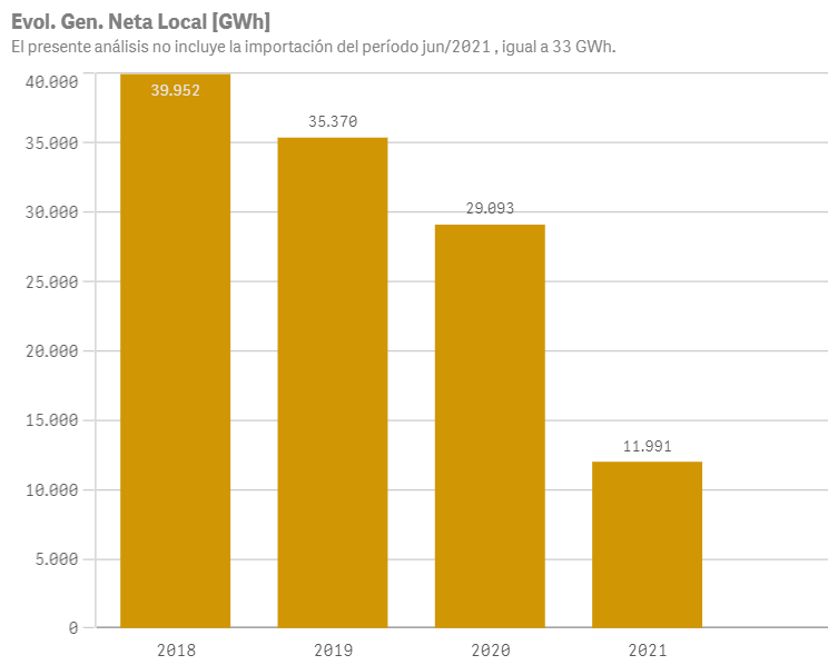 En concreto, en 2018 las represas del país aportaron 39.952 GWh al sistema eléctrico nacional, un año más tarde ese aporte cayó un 11,46% y cerró el 2019 con 35.370 GWh. Ya el año pasado la caída fue aún más pronunciada, dado que con una generación total de 29.093 GWh, la baja llegó al 17,74%.