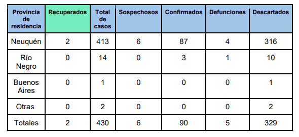 En el parte anterior, se había sumado un contagio en Loncopué, de un hombre de 44 años y ya son 29 los infectados en el pueblo. Anoche, también se descartaron 17 casos sospechosos en la provincia.
