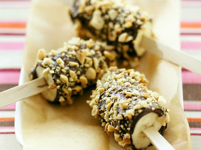 - Derretir el chocolate, sumergir las porciones de banana ya congeladas en el mismo. Rebozar con lo que más te guste y llevar al frío nuevamente.
