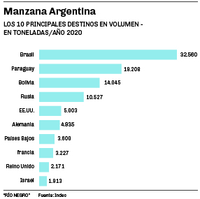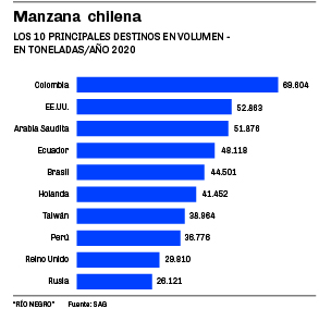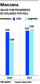-Los valores promedio logrados en destino. La recopilación estadística destaca que los 10 principales mercados de exportación -en volumen- hacia donde se orienta la manzana chilena concentran el 65% del total de sus ventas externas de este producto, obteniéndose un promedio de 0,88 dólares por kilo (similar al promedio global). Para el caso del Valle de Río Negro y Neuquén, los 10 principales destinos concentran cerca del 90% del total de las colocaciones externas de manzanas logrando un valor FOB promedio de 0,64 dólares por kilo (por debajo de la media global). Ampliando la información, la combinación de factores comerciales (volumen para generar mejor posición negociadora, calidad de la oferta, matriz exportadora diversificada y una clara estrategia público-privada) son los que también marcan claras diferencias entre ambos países.