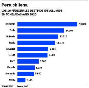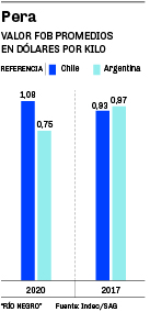Las colocaciones argentinas de peras lograron el año pasado un valor promedio de 0,75 dólares por kilo contra los 1,08 de las chilenas.