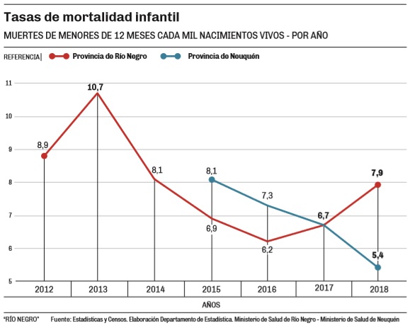 Las estadísticas del Ministerio de Salud muestran cambios negativos en algunos índices después de varios años de mejora. La Tasa de Mortalidad Infantil (TMI) llegó, el año pasado, a un promedio general de 7,9 por mil nacidos vivos en la provincia de Río Negro. Volvió a crecer, tal como lo hizo en 2017. Esta tendencia contrasta con la vecina provincia de Neuquén, donde se acentuó la baja.