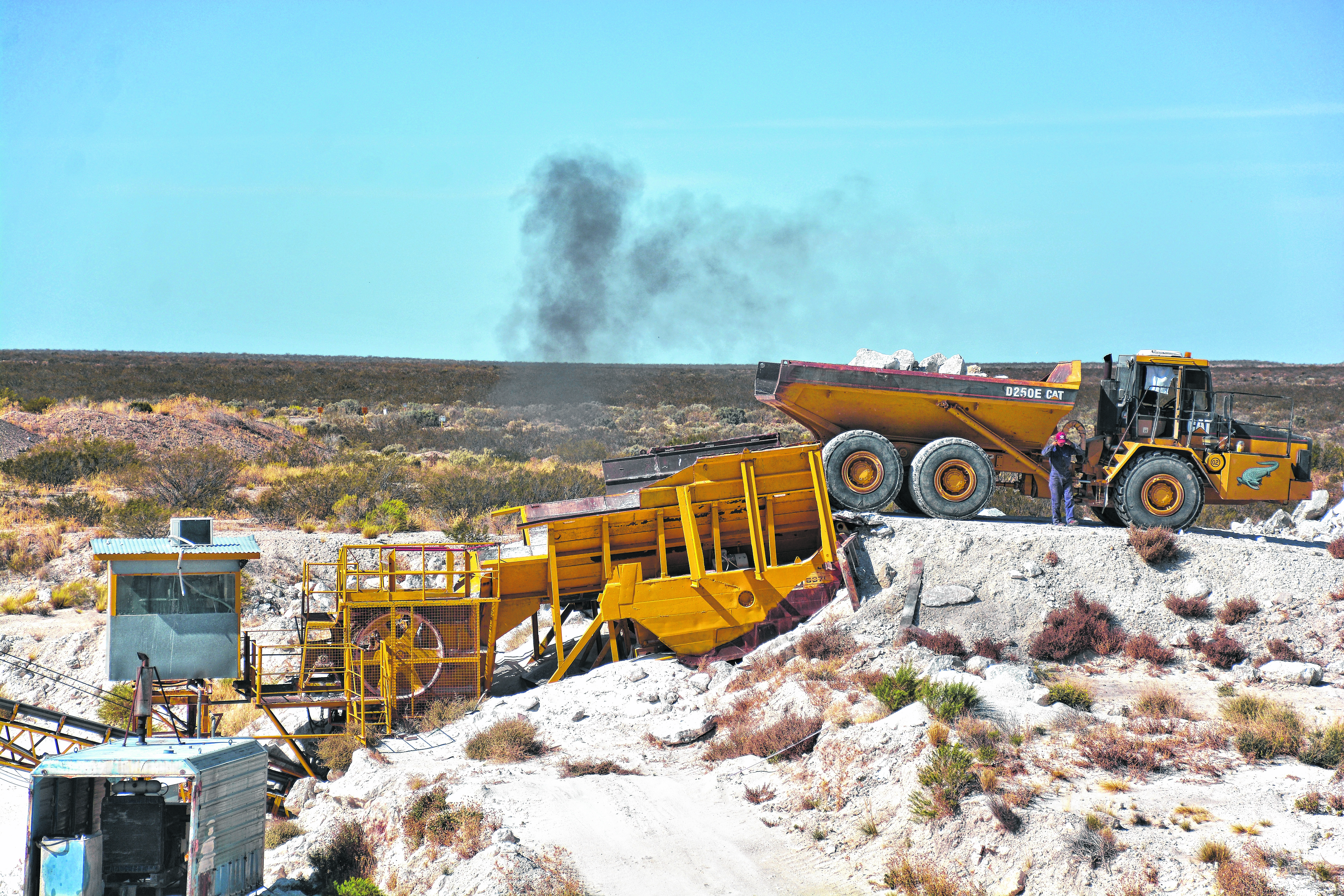 Seis camiones repletos de carga esperan salida al borde de la cantera de un yacimiento en Roca. Abajo, dentro del hueco inmenso que formaron las extracciones, dos máquinas trituradoras cortan las piedras grandes y las dejan en un tamaño de 30 centímetros. De repente, toda la actividad se paraliza. Tres sirenas dan aviso y lo que sigue es una gran detonación con explosivos. Cuando la nube de polvo se disipa, 15 toneladas de piedras blancas quedan a la vista, listas para ser procesadas.
