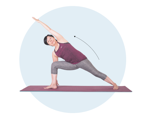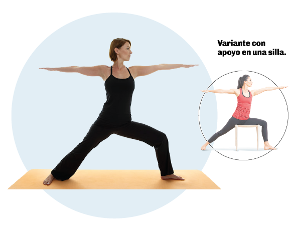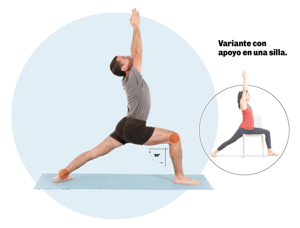Para subir, inhala, presiona firmemente el talón trasero en el suelo y estira la rodilla derecha formando un ángulo recto.