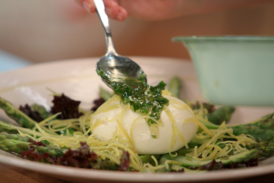 En el centro de la fuente con lechuga y espárragos, poné la burrata.