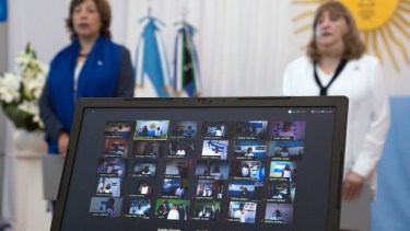 La gobernadora, a través de una conexión vía Zoom, fue la encargada de tomar la promesa a los estudiantes, acompañada por la ministra de Educación y Derechos Humanos, Mercedes Jara Tracchia.