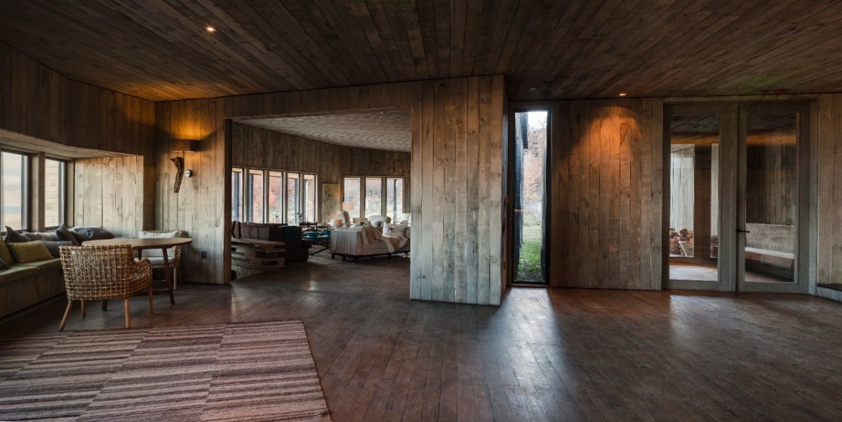 “Se compone de doce habitaciones más sus áreas comunes. Se inició con la condición autoimpuesta de esconderlo en el paisaje; la vastedad de la pampa patagónica no permitía la interrupción de un “edificio” en una suerte de silencio permanente. Por eso optamos por unidades aisladas, a modo de cabañas “esparcidas” en la pradera al borde de un bosque compuesto por lenga, ñirre y cohigue”, responde Assadi por mail a nuestra entrevista.
