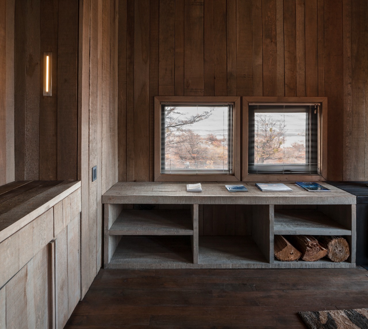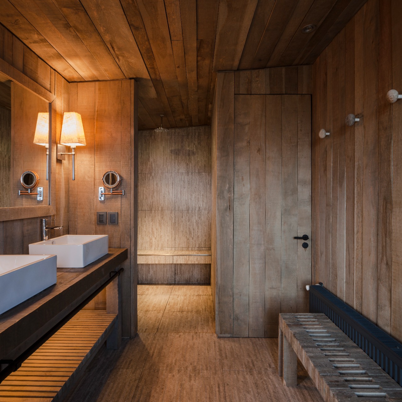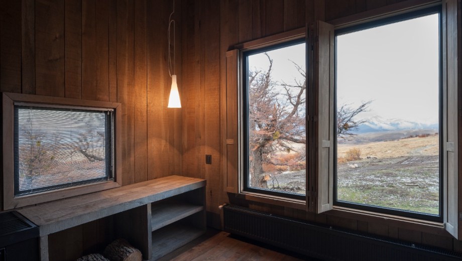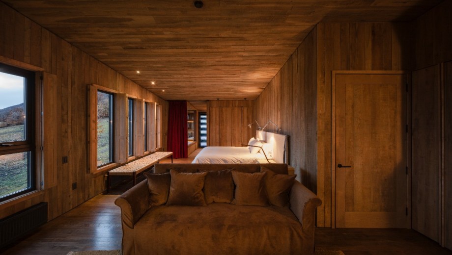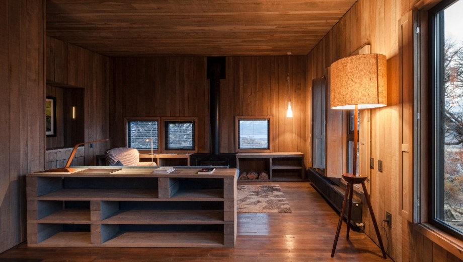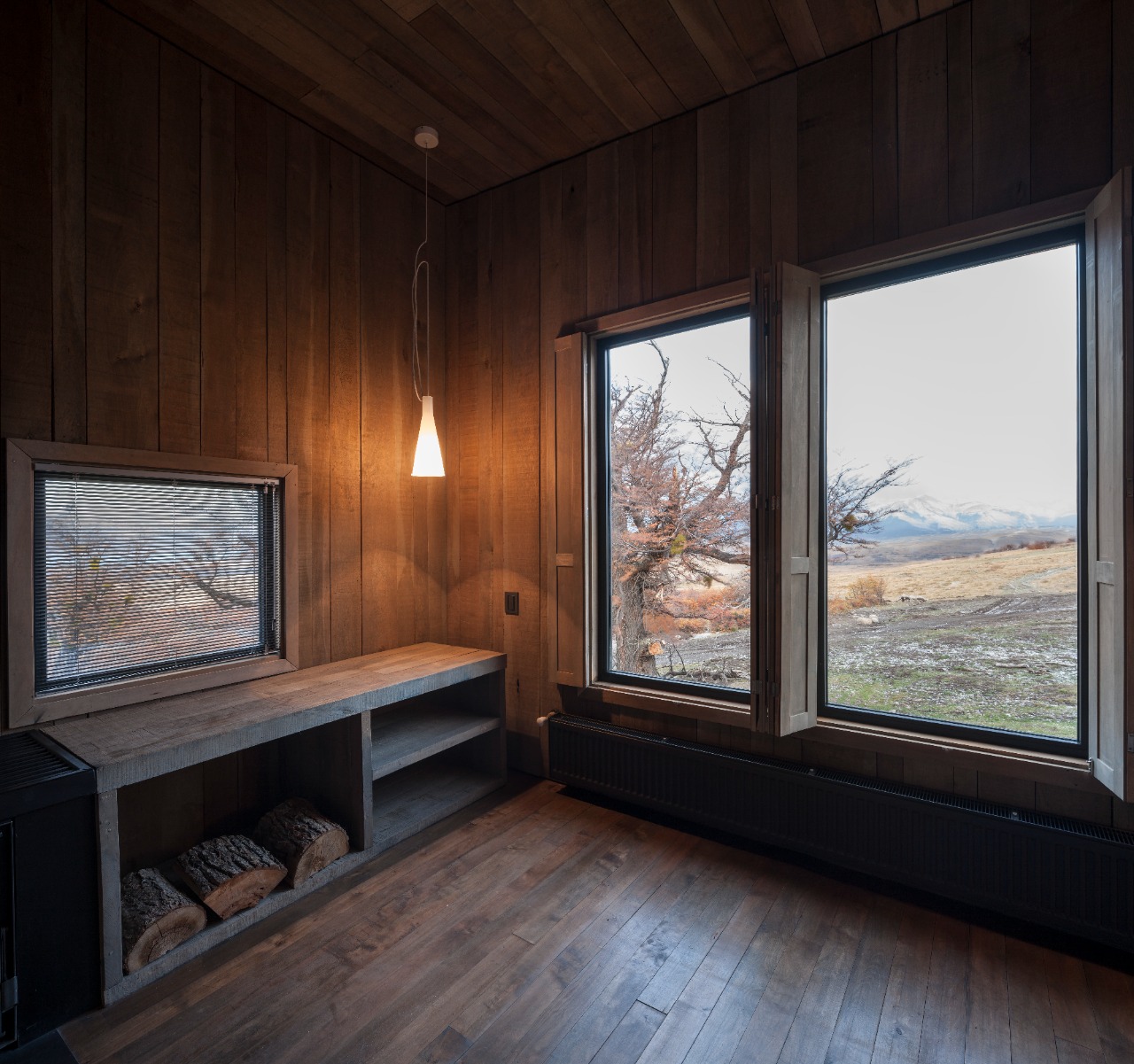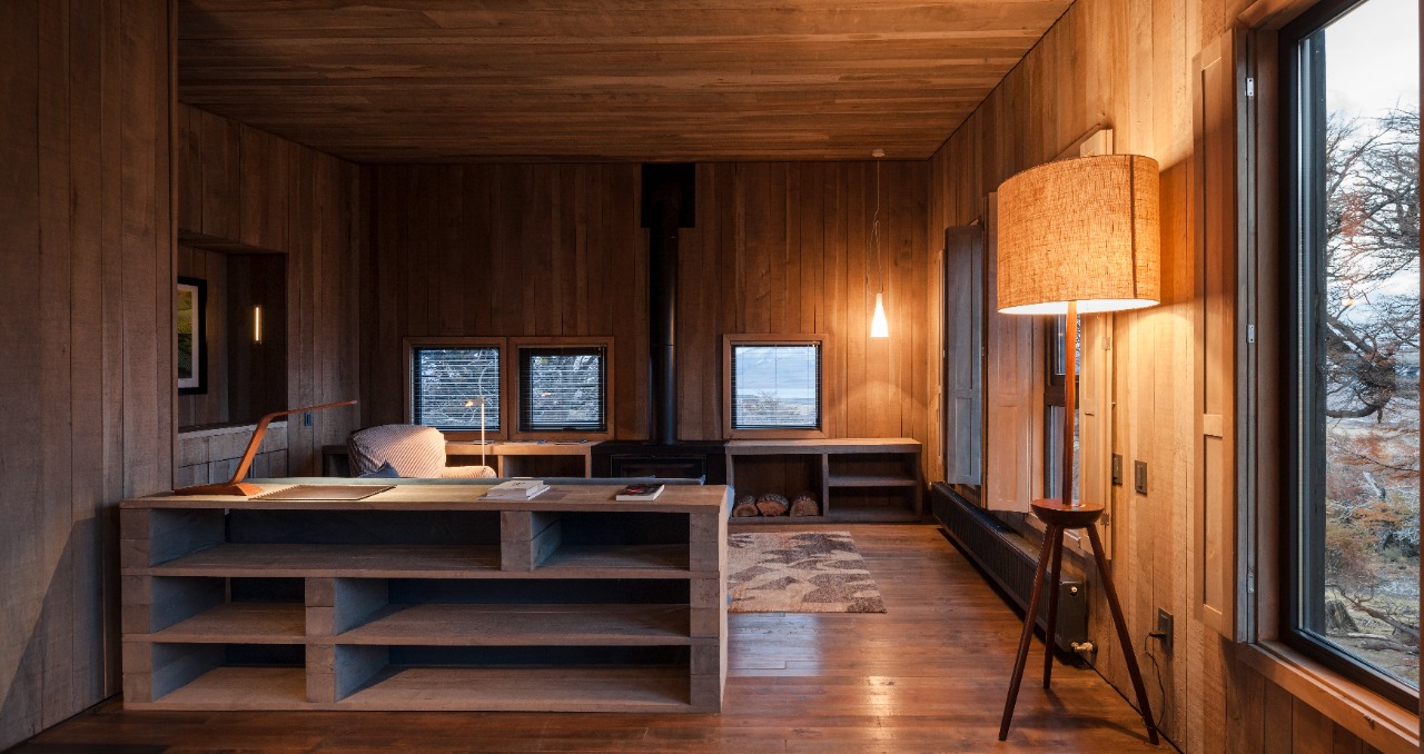 “Se compone de doce habitaciones más sus áreas comunes. Se inició con la condición autoimpuesta de esconderlo en el paisaje; la vastedad de la pampa patagónica no permitía la interrupción de un “edificio” en una suerte de silencio permanente. Por eso optamos por unidades aisladas, a modo de cabañas “esparcidas” en la pradera al borde de un bosque compuesto por lenga, ñirre y cohigue”, responde Assadi por mail a nuestra entrevista.