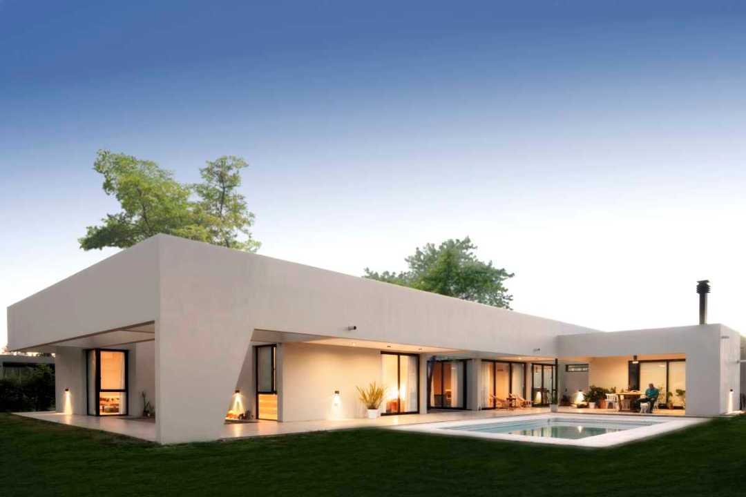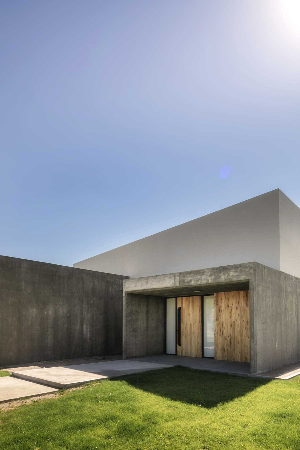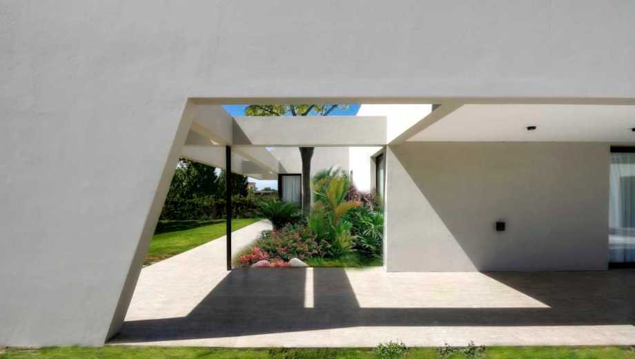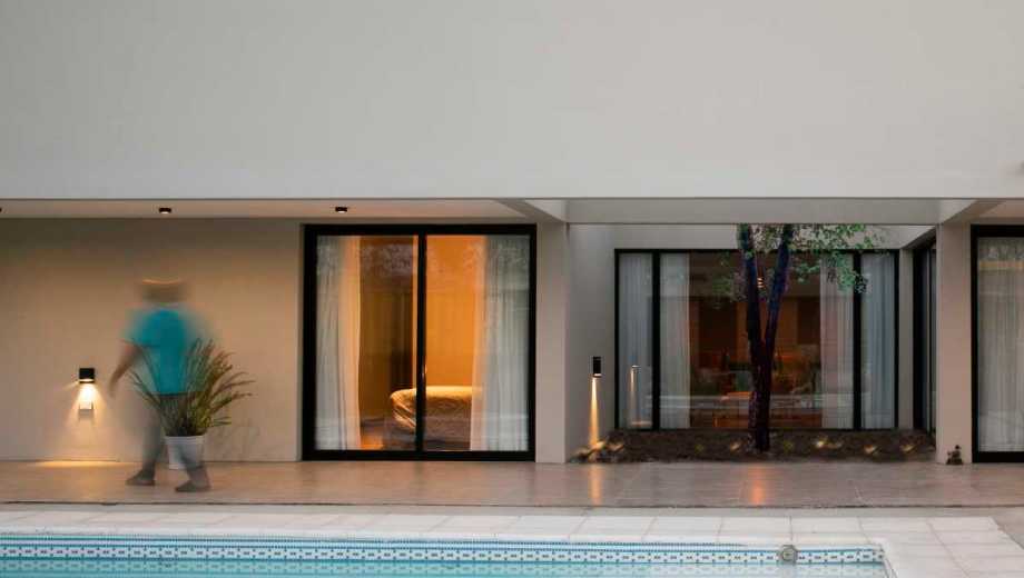 Introvertida en su frente oeste un gran muro de hormigón recibe al morador marcando su acceso que lo lleva a un interior cálido y flexible, calado por tres patios internos que proporcionan calma y sosiego a través del verde y la luz en todos los ambientes. La madera y grandes paños vidriados conviven como entusiastas de una galería que atraviesa todo el jardín.