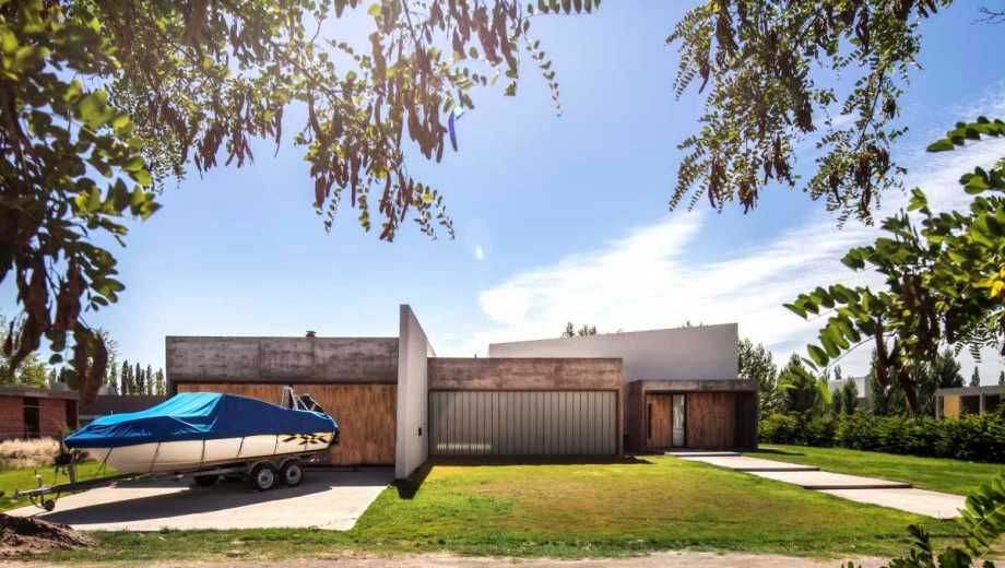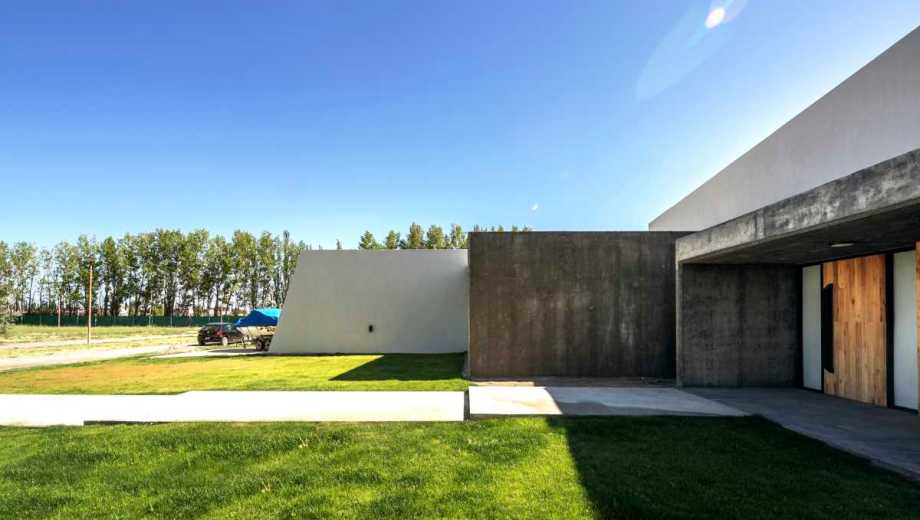 La madera, los grandes paños vidriados y el hormigón que se impone brutalmente dan identidad a este nuevo proyecto de un estudio del Alto Valle.