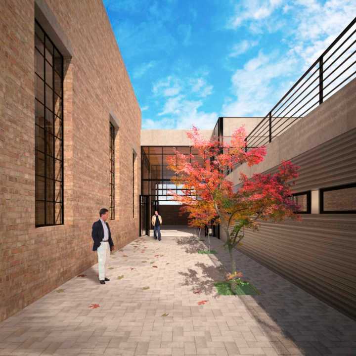 Al ingresar al edificio, luego de atravesar el acceso semicubierto nos encontraremos de frente con una carpintería de seis metros de altura, y, a través de la misma, podremos apreciar el patio interno que hace de fuelle entre lo existente y lo nuevo, permitiendo así apreciar la cara norte de la usina.